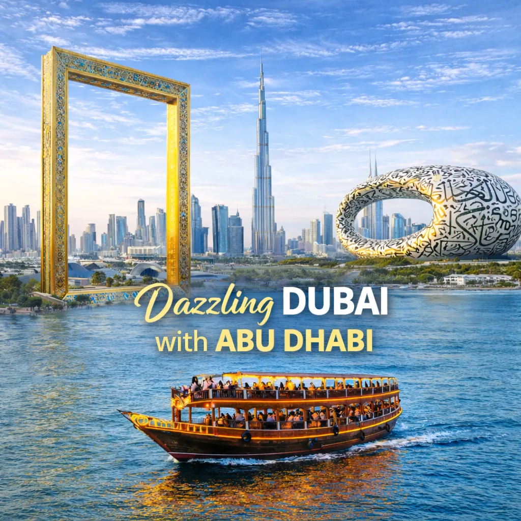After breakfast, depart for Abu Dhabi. Enjoy a panoramic Abu Dhabi city tour en route, including a visit to the magnificent Sheikh Zayed Grand Mosque. Continue to BAPS Hindu Mandir, followed by a photo stop at Ferrari World. Overnight at the hotel in Abu Dhabi.